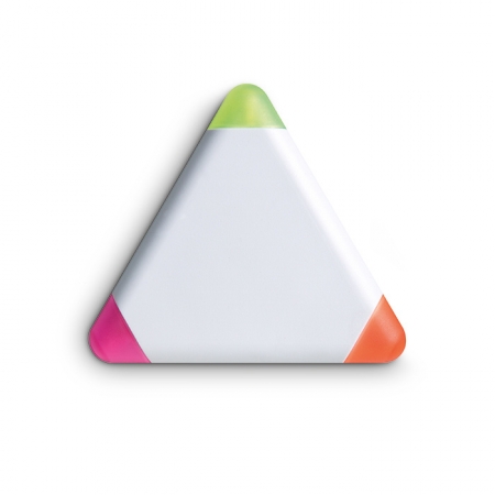 Surligneur en ABS de forme triangulaire. Trois couleurs d'encre : jaune, fuchsia et orange.