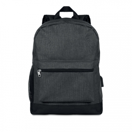 Zaino in poliestere bicolore 600D. Imbottitura antifurto con chiusura nascosta con cerniera e tasca esterna visibile. Vano interno antifurto RFID e vano telefono. Include tasca per bottiglia o ombrello.