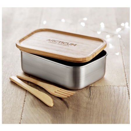 Portapranzo in acciaio inossidabile con coperchio in bamboo e 2 posate con fascia in poliestere removibile. Capacità 600 ml. Il bamboo è un prodotto naturale, potrebbero esserci lievi variazioni di colore e dimensioni da un articolo all'altro, che possono influire sul risultato finale della personalizzazione.